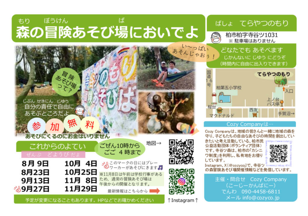 千葉県柏市の街なかにある約5,000㎡の民有林を整備して「森の冒険あそび場」を開催したり、柏駅前通りの歩行者天国を利用して「ハウディモールみちあそび」を開催したり、主に子どもたちにとって居心地のいい居場所づくりに取り組んでいます。