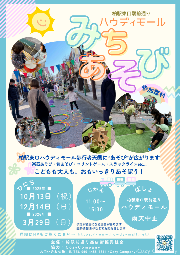 - ハウディモールみちあそび(12月22日開催)2024年12月22日(日)11:00~15:30に、柏駅東口にある柏駅前通りハウディモールの歩行者天国で「ハウディモールみちあそび」を開催します。 通りがみんなの遊び場になります。 こどももおとなもみんなで楽しく遊 […]